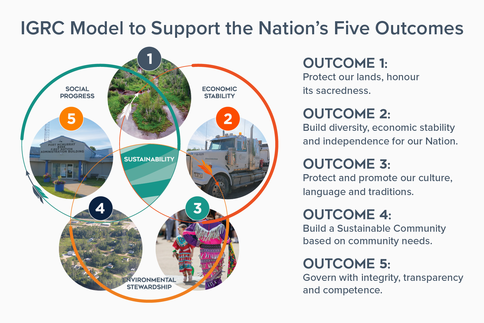 To achieve greater alignment with the Nation’s overall vision and mandate. IGRC has created a model that supports FMFN468's five outcomes. (see image below).